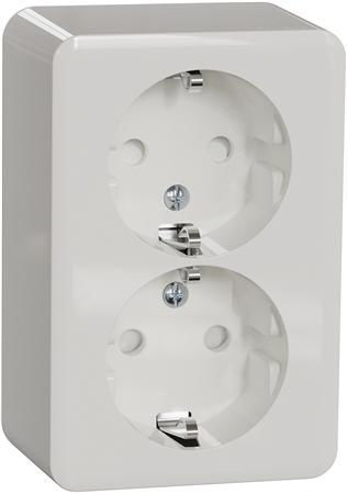 Vägguttag 2-vägs för utanpåliggande installation med integrerad bottenplatta. 16AX, 250V, jordat, med 2st neutrala överkopplingsklämmor, petskyddat. Snabbanslutning. Ingångar för kablar från baksidan genom utbrytningar i bottenplattan eller från alla sidor med hjälp av utklipp i locket. Produkten är IP20 (även med kåpan borttagen). IP21 då kabeln förs in underifrån.