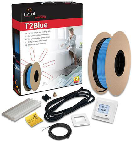 T2Blå-10 golvvärmepaket m termostat SENZ wifi och tillbehör limstavar, givarslang, märkskylt, front (typ ELKO). 10W/m